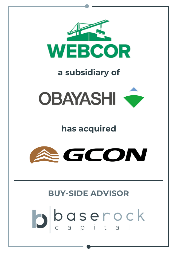 BaseRock Capital, LLC, a wholly owned subsidiary of BaseRock Partners, today announced it served as the exclusive financial advisor to Webcor, LP (“Webcor”), a premier California-based general contractor and a subsidiary of Obayashi Corporation (Tokyo Exchange; 1802.T), on its announced acquisition of GCON, Inc. (“GCON”), a full-service construction management firm with a strong nationwide presence in high-growth technology and mission-critical sectors. Financial terms were not disclosed.